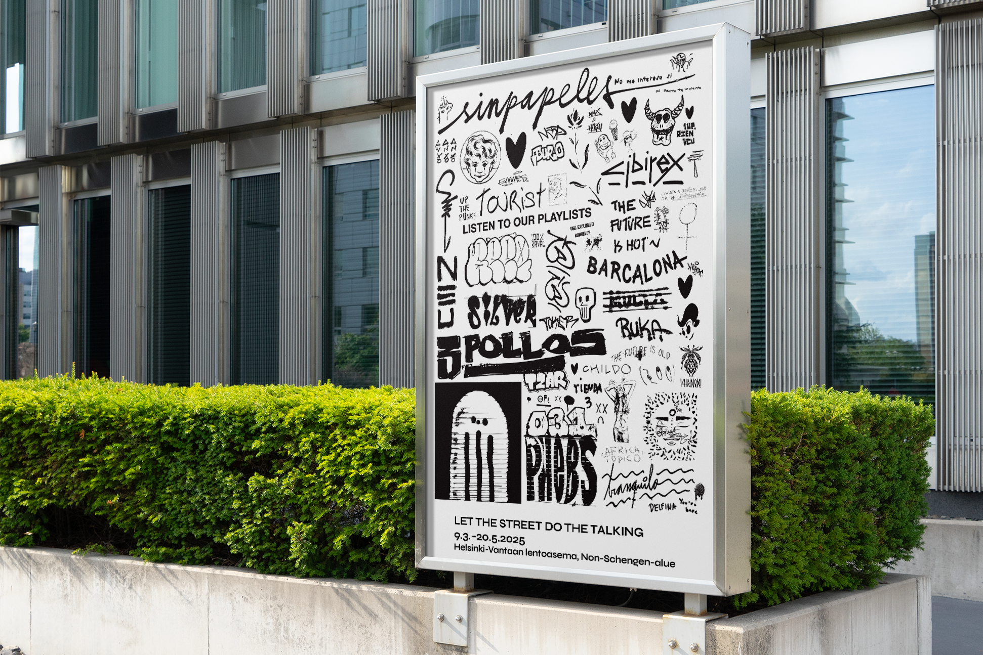 Kansainvälinen näkökulma on meille luonteva osa tekemistä. Teoksemme ovat ottaneet kantaa ja kunnioittaneet urbaania kulttuuria myös Suomen rajojen ulkopuolella – kuten kunnianosoitus Barcelonan MACBA-museon ympärille rakentuneelle globaalille street art -yhteisölle. Uskomme, että vahva visuaalinen idea puhuttelee yli rajojen.